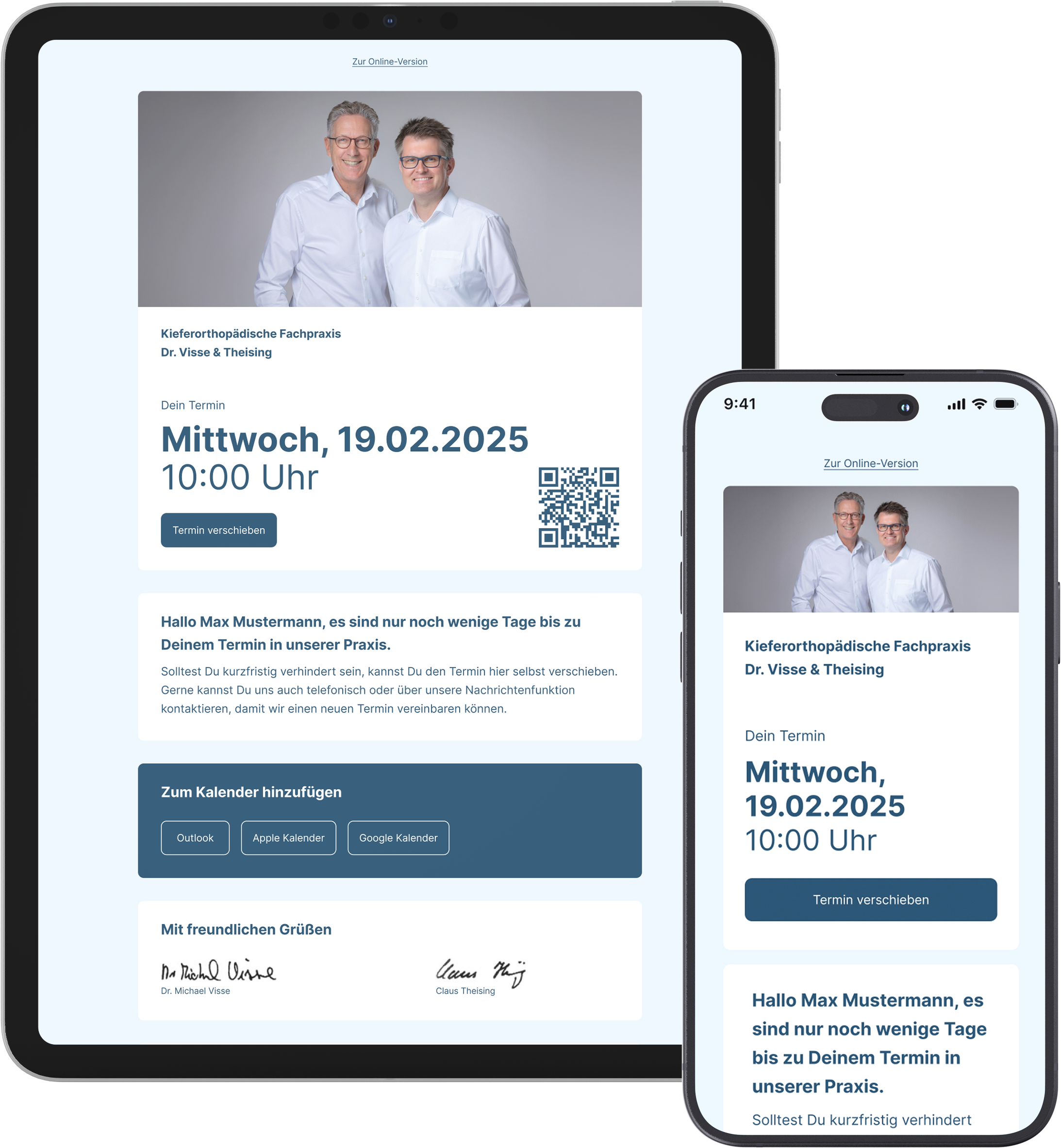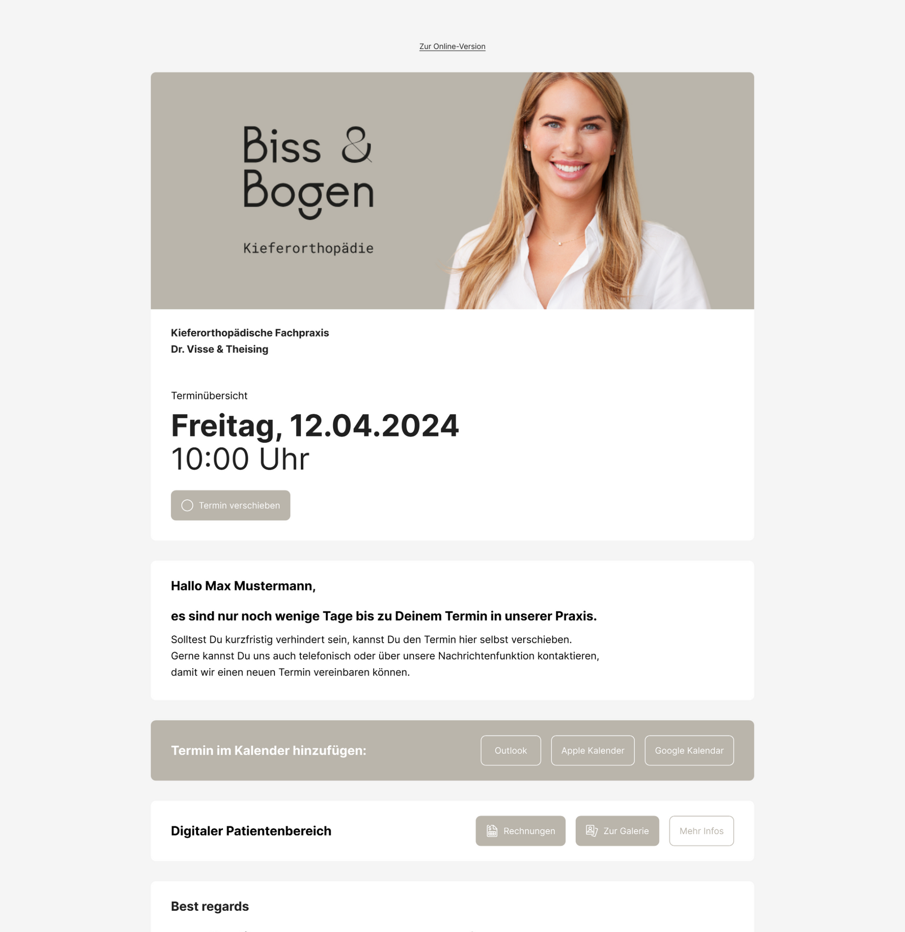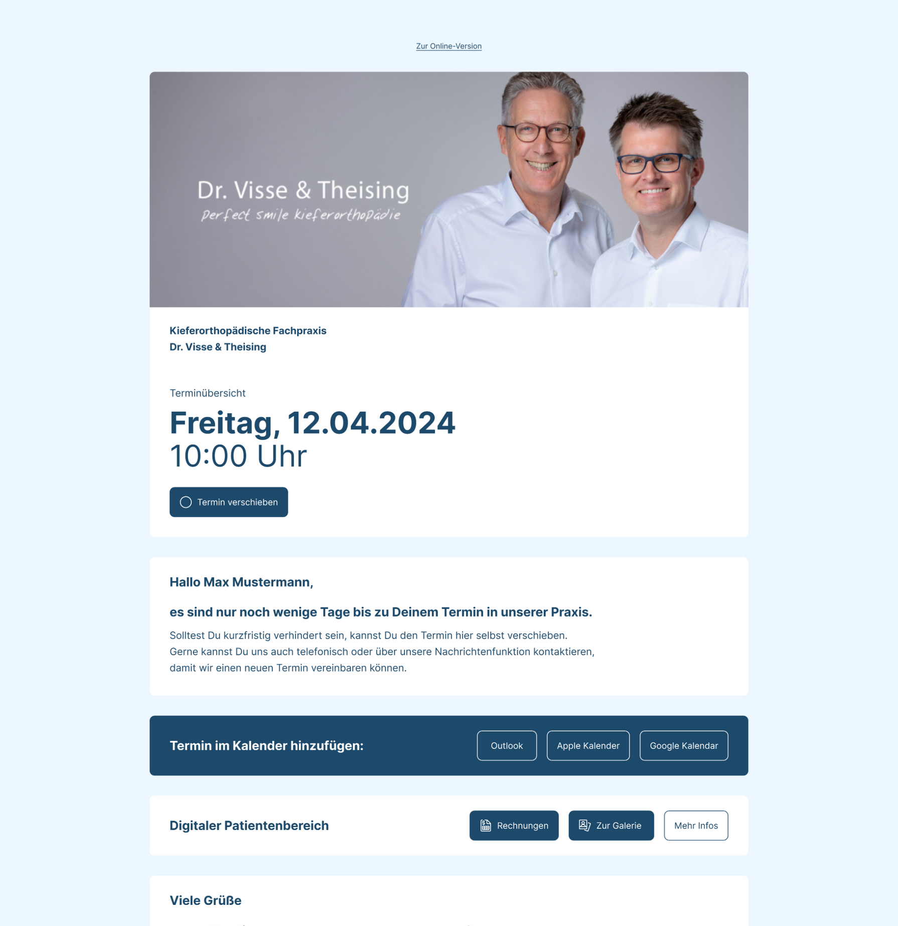 Die Termintemplates versenden automatisch Informationen an Ihre Patient:innen, sobald ein Termin erstellt, verschoben oder bestätigt wird. Dadurch werden Patienten zuverlässig erinnert und Rückfragen in der Praxis reduziert.